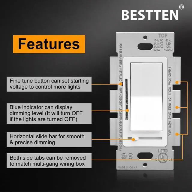 Wider compatibility: Fine tune button beside the wall plate on left side can modify the stable light level in order to maximize the dimming range if flickering occurs