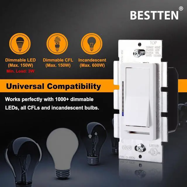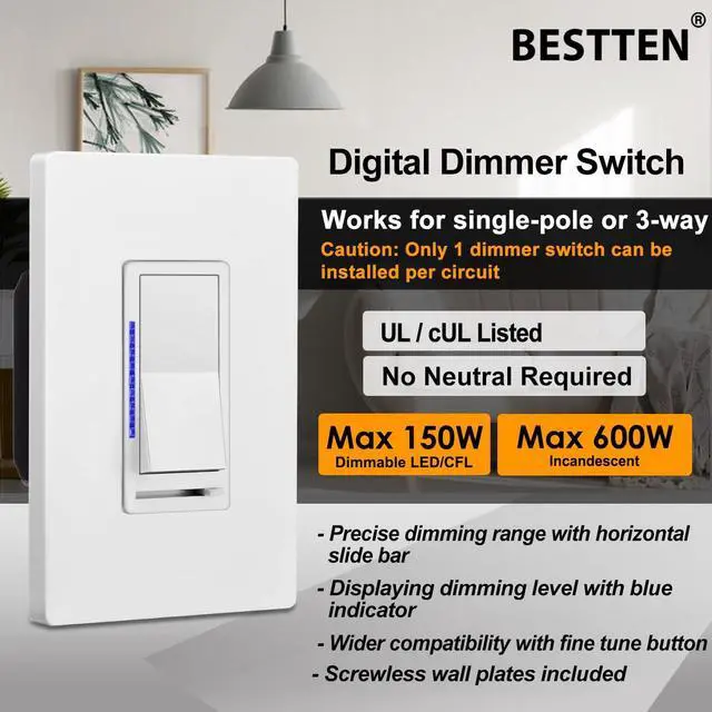 Electrical digital dimmer switch with screwless wallplates: Pre-program to dim lights and lamps, provide the best dimming performance while saving energy, easily dims and brightens dimmable LEDs/CFLs (max. 150W) and incandescent/halogen bulbs (max. 600W), 120VAC, 60Hz. Min. Load for LED lights: 3W. Caution: Only 1 dimmer switch can be installed in a 3-way circuit. Do not use with fans