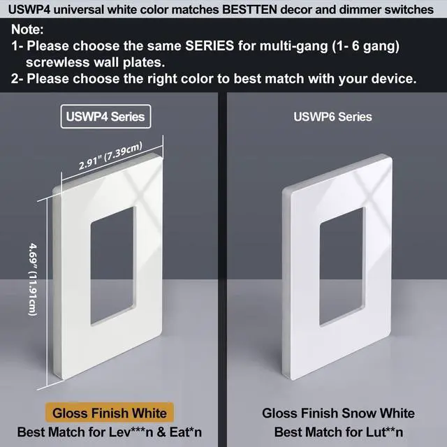 USWP4 series for white color and USWP6 series for snow white color. To match your outlets/switches, please select the right series and color