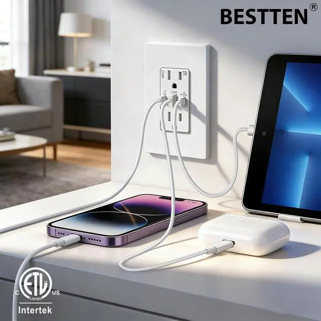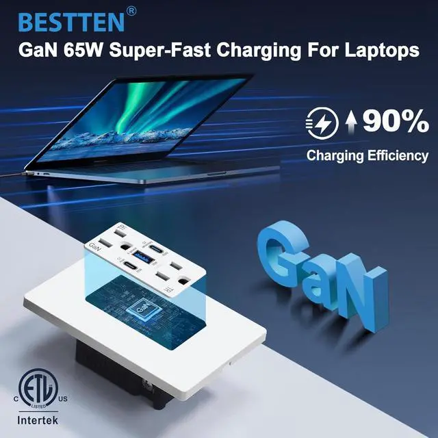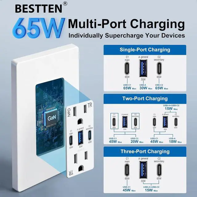 65W 3-Port High-Speed USB Wall Outlet : 2 PD 3.0 USB-C (65W max per port) + 1 Quick Charger 3.0 USB-A (30W max). Main USB-C port delivers a stable 45W output even during simultaneous charging for multi-device efficiency