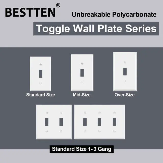 1 gang toggle wall plates have two sizes available: standard size and over-size.