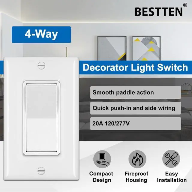 A smooth and quiet, yet positive, rocker paddle action allows you to feel the quality in which every BESTTEN switch is made. The modern look of a gloss white decor switch can enhance style, and add function anywhere a 4-way switch is needed