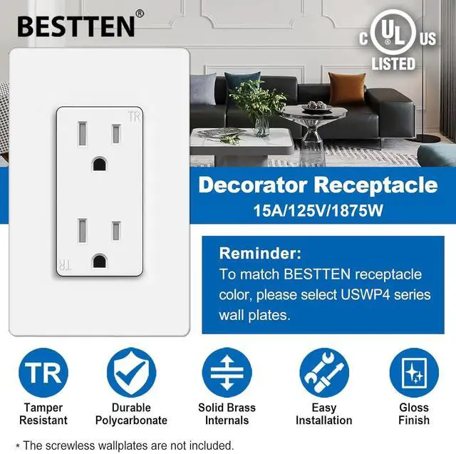 Standard Receptacle Outlet: 15 amp tamper resistant (TR) decor wall receptacle, 15A/125V/1875W, gloss off white, cUL listed. To match BESTTEN receptacle color, please select USWP4 series wall plates (sold separately)