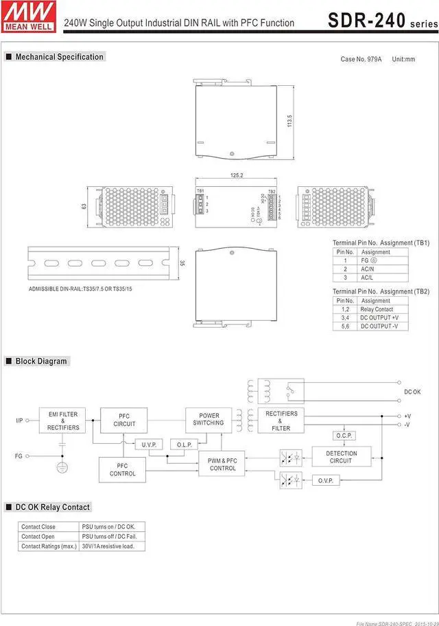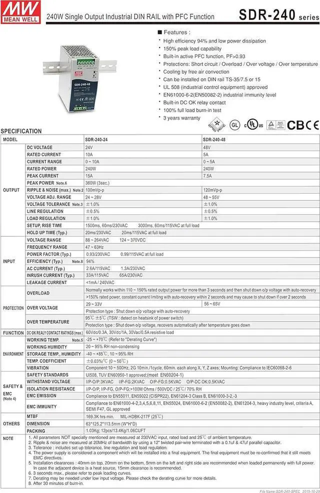 MW Mean Well SDR-240-48 48V 5A 240W Single Output Industrial DIN Rail with PFC Function Power Supply