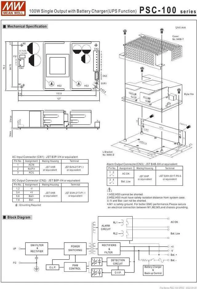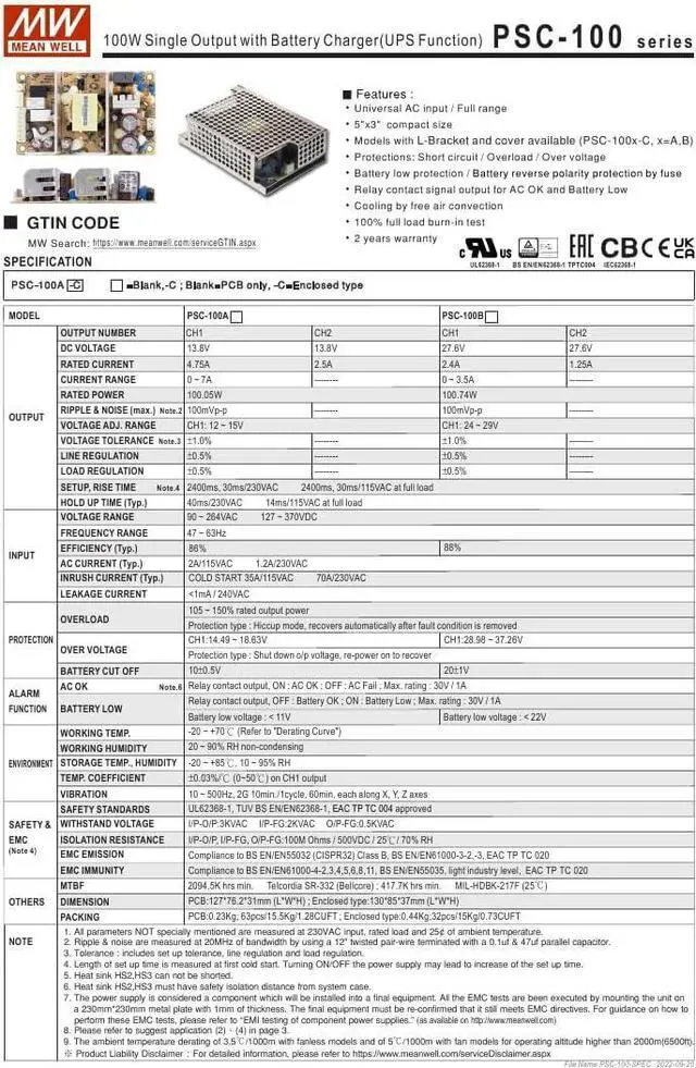 Mean Well PSC-100B 100W Single Output with Battery Charger(UPS Function)