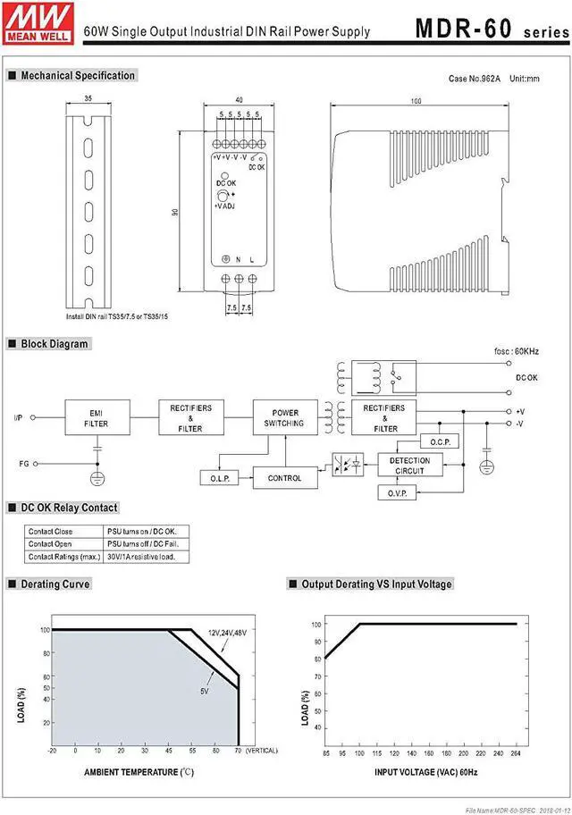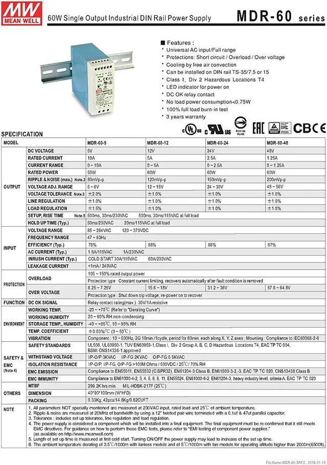 60W DIN-RAIL SWITCHING POWER SUPPLY 12 Volts 5 Amps Specifications : Universal AC input range Protections: Short-circuit, Overload, Overvoltage 100% Full load burn-in test Soft-start circuit, limiting AC surge current Input Voltage: 85-264VAC 47-63Hz, or 120-370VDC Input Current Full load: 1.8A(115V) 1.0A(230V) Size: 3.9 x 1.6" x 3.5" Weight: 0.7 lbs. 3-year warranty For more 12 Volt power supplies . Detailed Specifications: Primary Output Voltage (VDC): 12 Output Current (A): 5 Maximum Output Power (W): 60 Family: MDR-60 Input Voltage (VAC): 85 to 264 Input Frequency: 47 to 63 Maximum Input Current (A): 1.8 Output Connector Type: Screw Terminal Efficiency (%): 86 Operating Temperature-Min (Cell): -20 Operating Temperature-Max (Cell): 70 Length (inch): 1.57 Width (inch): 3.54 Height (inch): 3.94 Agency Approvals: ULCULTUVCBCE Color: White Style: DIN".
