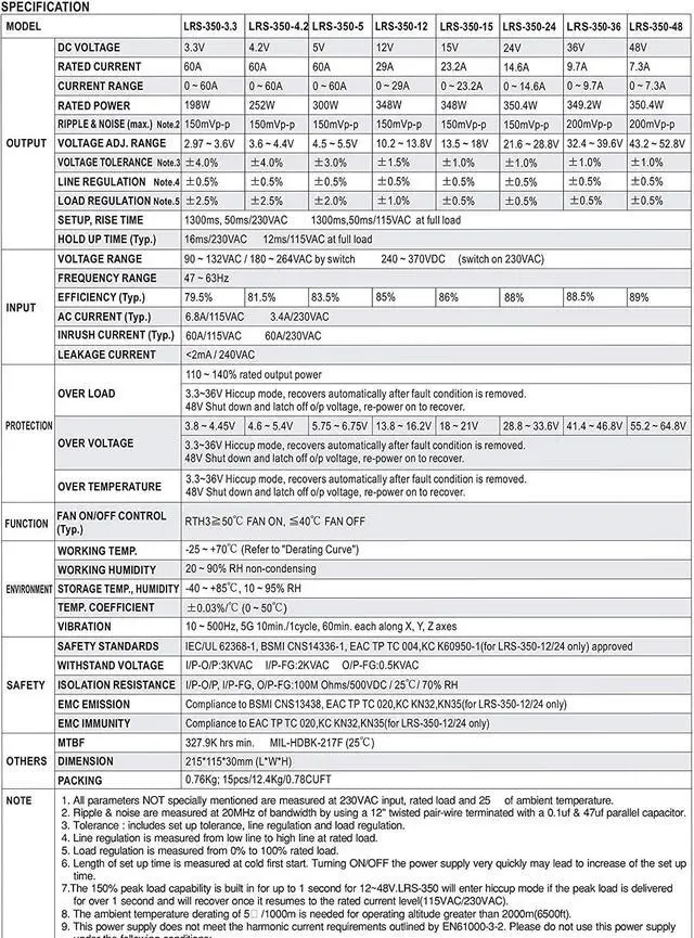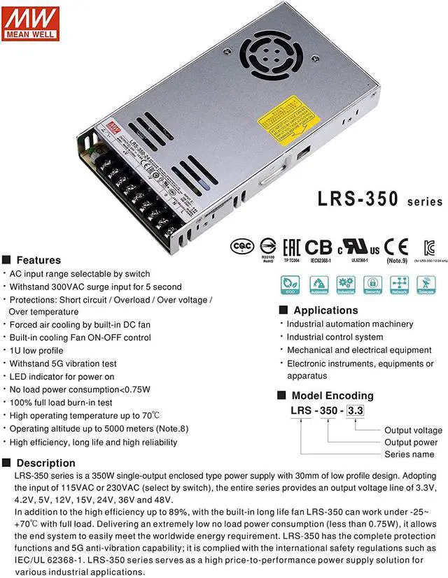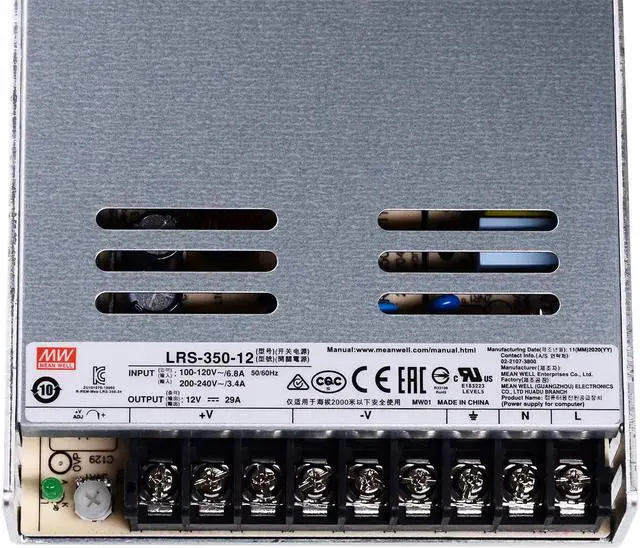 Meanwell LRS-350-12 is a 350W single-output enclosed type power supply with 30mm low profile design. It features universal input (115VAC/230VAC switch-selectable) and delivers a stable 12V DC output at 29.2A max current, ideal for industrial automation, LED lighting, telecom, and CCTV systems. Key Features: 89% High Efficiency Reduces energy waste and operating costs. Wide Temp Range (-25°C to +70°C) Reliable performance in harsh environments. Built-in Cooling Fan Ensures long-term durability and thermal management. Full Protections Overcurrent, overvoltage, and short-circuit safeguards. UL, CB, CE Certified Compliant with global safety standards.
