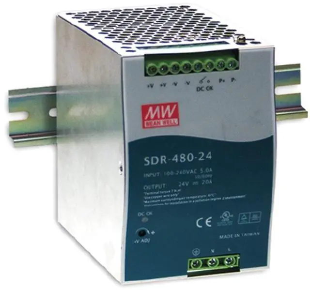 480 Watt 24V 20A DIN Rail Switching Power Supply 24 Volts 20 Amp Specifications Universal AC input range Protections: Short-circuit, Overload, Overvoltage, Over temperature 100% Full load burn-in test Soft-start circuit, limiting AC surge current Input Voltage: 88-264VAC 47-63Hz, or 124-370VDC Input Current Full load: 2.6A(115V) 1.3A(230V) Size: 4.9 x 3.4" x 5.0" Weight: 4.9 lbs. 3-year warranty Detailed Specifications: Primary Output Voltage (VDC): 24 Output Current (A): 20 Maximum Output Power (W): 480 Family: SDR-480 Input Voltage (VAC): 90 to 264 Input Frequency: 47 to 63 Maximum Input Current (A): 5 Output Connector Type: Screw Terminal Efficiency (%): 94 Operating Temperature-Min (Cell): -25 Operating Temperature-Max (Cell): 70 Length (inch): 3.37 Width (inch): 4.93 Height (inch): 5.06 Agency Approvals: ULCULTUVCBCE Color: Silver Style: DIN".
