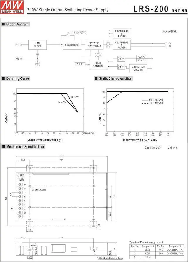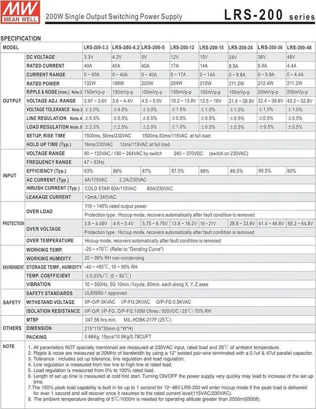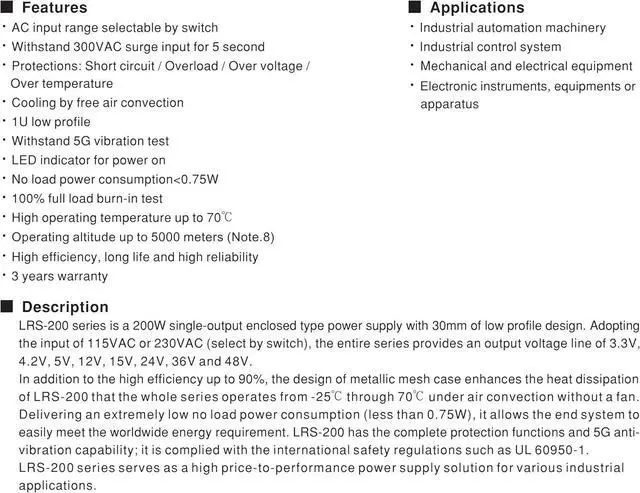 Ac input range selectable by switch Withstand 300Vac surge input for 5 snd Protections: short circuit / overload / over voltage / over temperature Cooling by free air convection 1U low profile