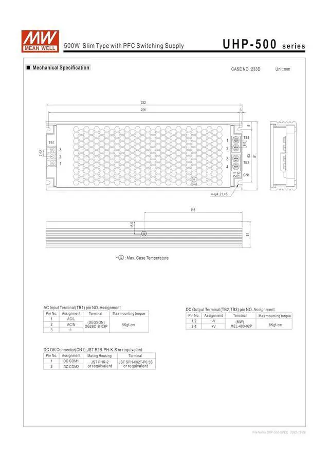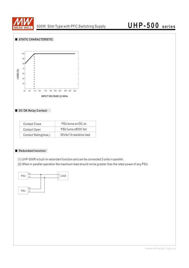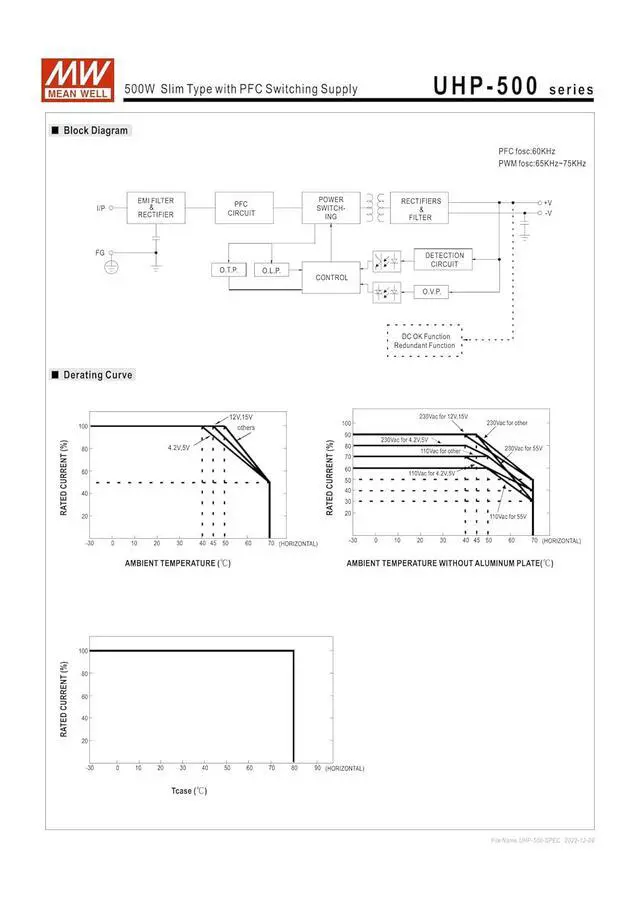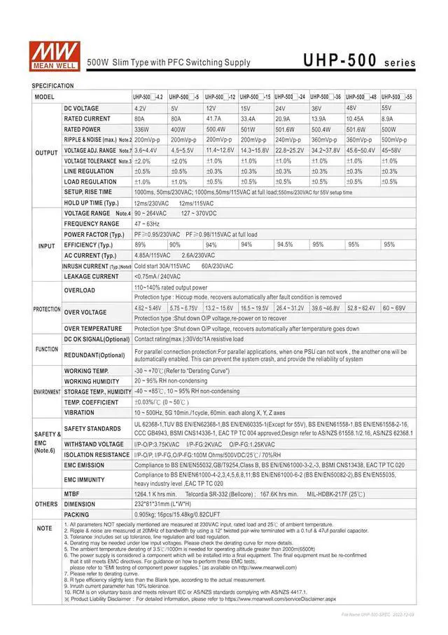 Mean Well UHP-500-12 500.4W Slim Type with PFC Switching Supply 12V/41.7A