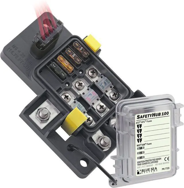 Safe for use on gasoline powered boats, reduces wiring connections and consolidates up to seven fused circuits