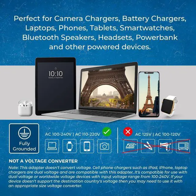 Important: This is just a travel adapter, it will not work with devices that require a voltage converter. It will only work with dual voltage products such as cell phones, chargers, & laptops etc.