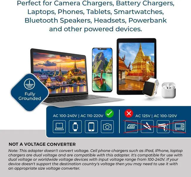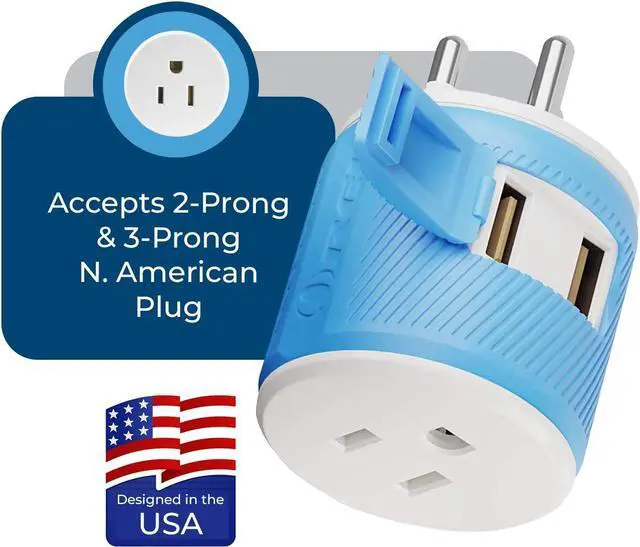3 inputs - This adapter accepts the standard USA n. American 2 or 3 prong flat pin Plug - dual USB charges up to 2.4a ideal for cell phone, iPhone, iPad, Samsung Galaxy, & other chargers