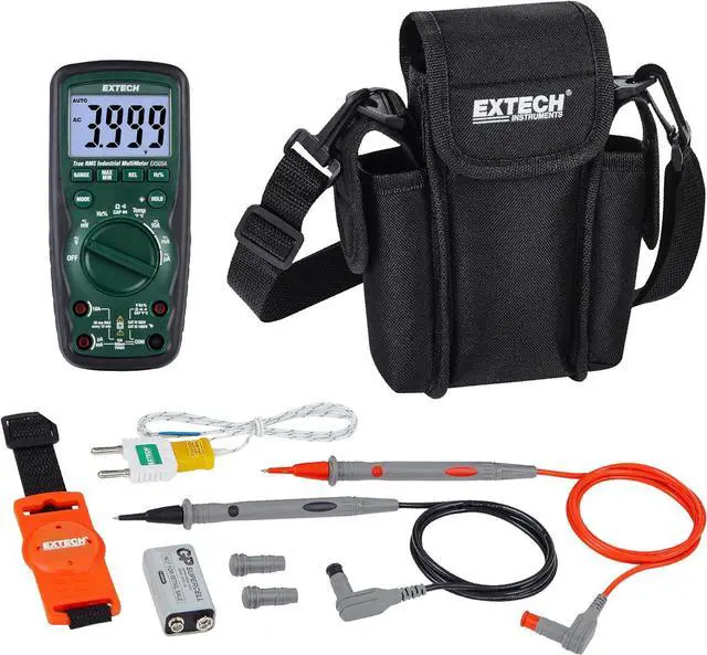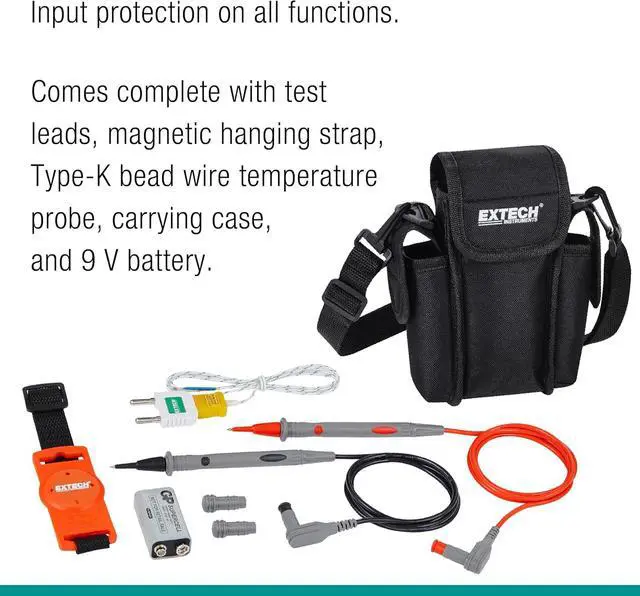 Comes complete with test leads, magnetic hanging strap, Type K bead wire temperature probe, carrying case, and battery