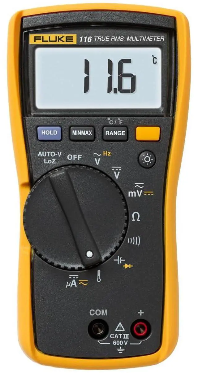 Built-in thermometer for HVAC applications Low input impedance: helps prevent false readings due to ghost voltage Large white LED backlight to work in poorly lit areas Compact ergonomic design for one-handed operation CAT III 600 V safety rated