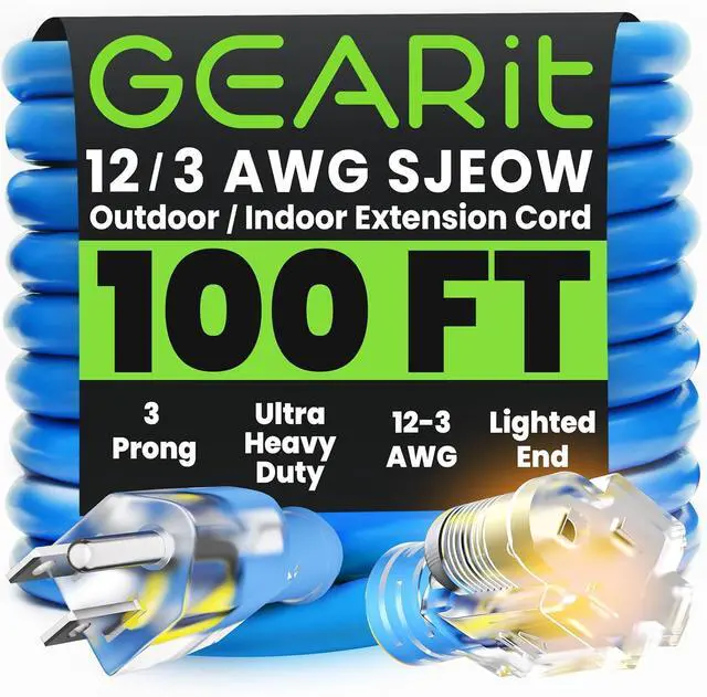 GEARit 12/3 Outdoor Extension Cord - Use this 100-foot outdoor extension cord with triple 3-prong connectors to reach power tools, gardening appliances, snow throwers and other power-hungry pieces of equipment wherever you need them, from front yards to professional construction sites, in all weather conditions thanks to the SJEOW jacket design.