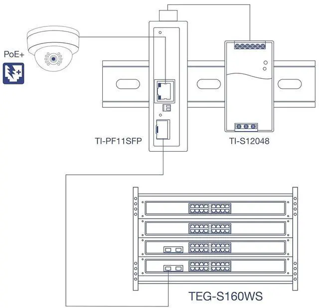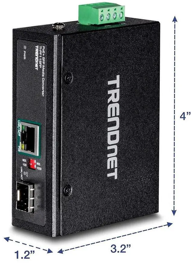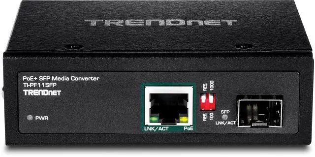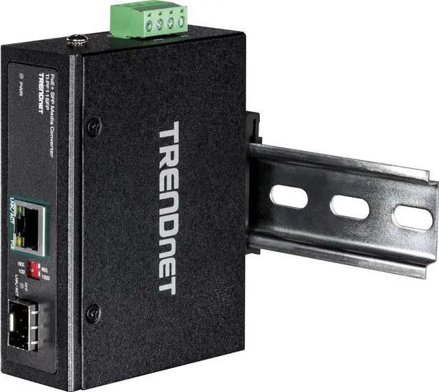 TRENDnets Industrial SFP to Gigabit PoE+ Media Converter, model TI-PF11SFP, converts fiber to copper while providing power to PoE and PoE+ compliant devices, such as IP cameras, VoIP phones, and wireless access points. With an operating temperature range of -40° 75 °C (-40° 167 °F), the hardened IP30 rated housing is suitable for extreme industrial environments. Dual power inputs (power supply sold separately: TI-S12048) with overload current protection minimizes downtime.