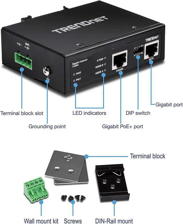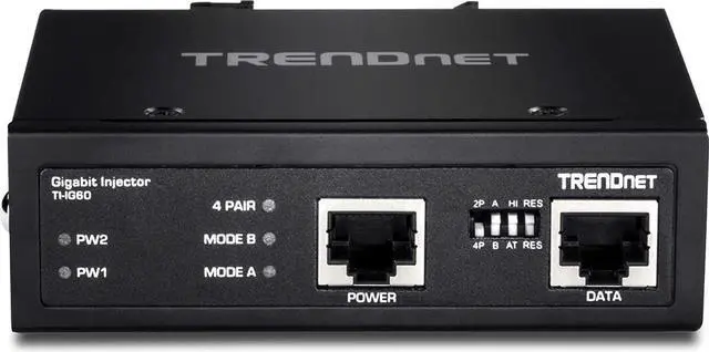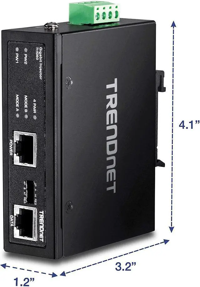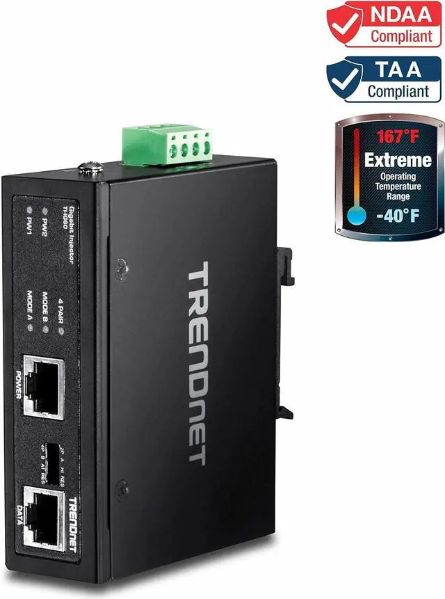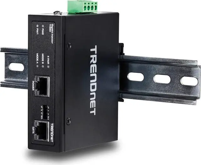 TRENDnet's TI-IG60 is a reliable IP30 rated Industrial Gigabit PoE Plus Injector with hardened components rated for extreme industrial environments. Connect the TI-IG60 to a non-PoE Gigabit switch and then run an Ethernet cable up to 100 meters (328-Feet ) to network a PoE device. The TI-IG60 supplies power to a PoE (up to 15 W), PoE Plus (up to 30 W), high power PoE Plus (36 W), or 60 Watt PoE device. Dual redundant power inputs (power supply sold separately: TI-S12048) with overload current protection support zero downtime applications. Both DIN-Rail and wall mount hardware is included.