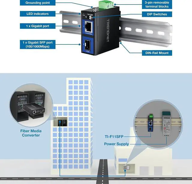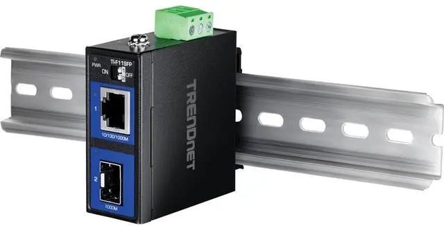 TRENDnet Hardened Industrial 100/1000 Base-T to SFP Media Converter, DIN-Rail and Wall Mount Hardware Included, Multi Or Single Mode Fiber, Power Supply Sold Separately, Black, TI-F11SFP
