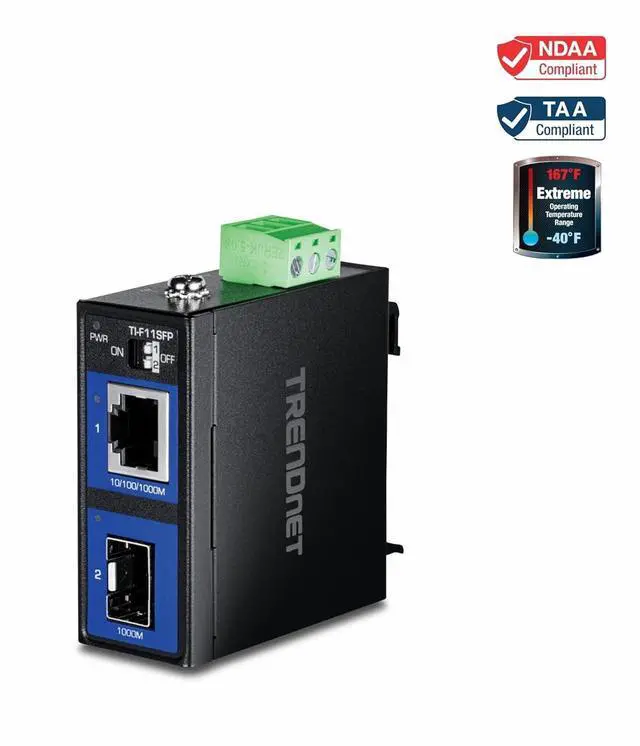 • NDAA + TAA COMPLIANT: With our NDAA and TAA compliant Hardened Industrial 100/1000Base-T to SFP Media Converter, you can plan and install networking solutions that Government customers demand today (U.S. and Canada Only)