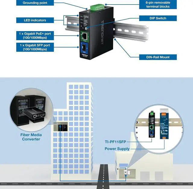 Powers supply sold separately (model TI-S12048); Up to 40 km fiber networking distances with the TI-MGBS40 SFP module; Provides up to 30W for PoE and PoE+ compliant devices