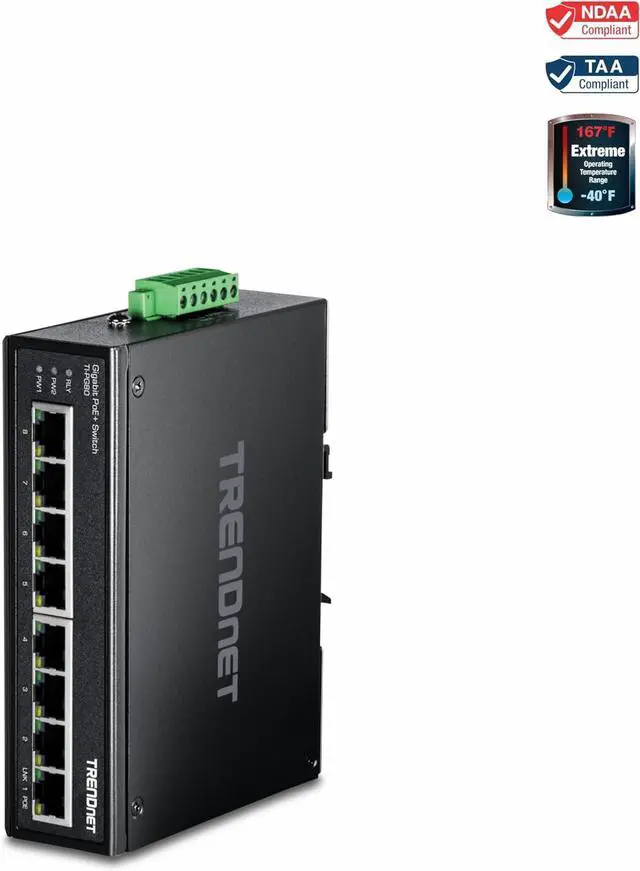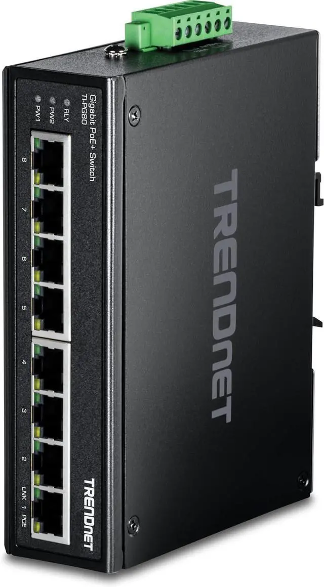 TRENDnet's TI-PG80 is a reliable IP30 unmanaged PoE+ DIN-rail switch with hardened components rated for extreme industrial environments. It offers 8 Gigabit PoE+ ports (802.3at/802.3af) and a PoE power budget of up to 200 Watts. Dual redundant power inputs (power supply sold separately: TIS24048) and a power failure alarm output trigger support zero downtime applications.