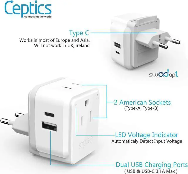 Connect up to 4 Devices: 2x US standard outlets - Accepts the standard N. American 2 or 3 prong flat pin NEMA 5-15 plug (including polarized), 1x USB & 1x USB-C (total max 3.1A); Compatible anywhere in the world