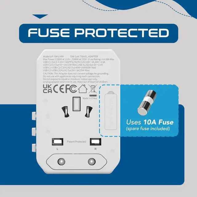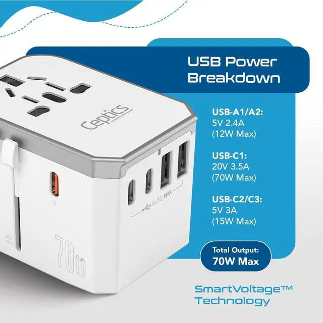 [USB C TRAVEL ADAPTER WITH POWER DELIVERY (PD)]: Our universal charger features 2x USB-A ports, 2x USB-C ports, and 1x PD 70W USB-C port, ensuring fast and efficient charging for your devices. The 70W USB-C port of our world travel adapter is ideal for charging devices like laptops, tablets, and smartphones quickly and safely.