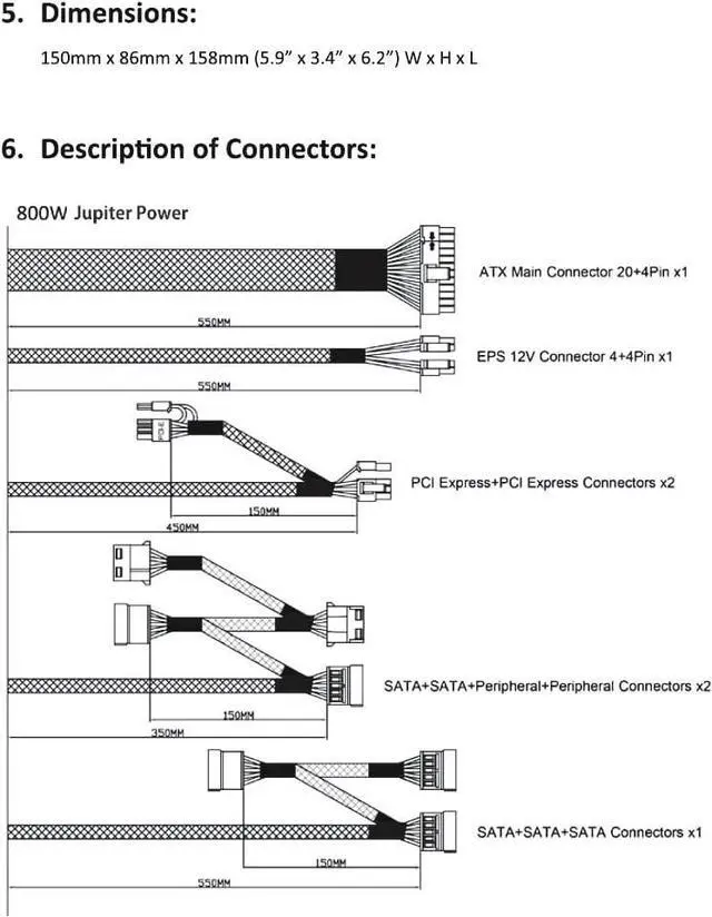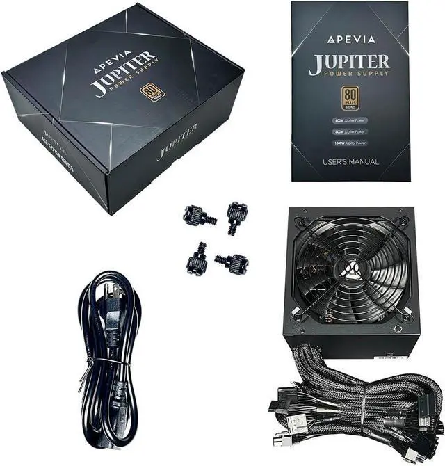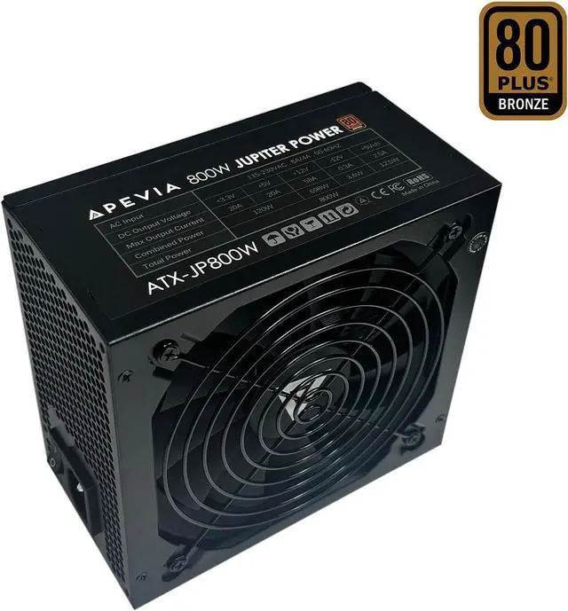 Apevia Jupiter series power supply is 80 Plus Bronze certified. It offers spellbinding performance for high-end PC gaming rigs and extreme systems that demand the most reliable and efficient energy source. This versatile PS supports NVidia SLI, as well as ATI crossfire and Haswell. The Jupiter series is also ideal for dual and quad core CPUs. The thermally controlled automatic sensor regulates fan speed while reducing noise. And a powerful 135mm black fan delivers outstanding ventilation. Model No.: ATX-JP800W Max. Power : 800W Material : Metal Color : Black Switches : Additional Power Switch 115/230 Volt Selector Switch (1)Product Features: 80 Plus Bronze Certified Universal AC Input by Active PFC (99% PF Typical) Cosmic Black Casing Supports Single 12V Output for Higher Power Usage Supports ATX 12V 2.3 Version Supports Dual/Quad Core CPUs Supports SLI, Crossfire & Haswell Automatic Thermally Controlled 135mm Black Fan All Cables are Sleeved Heavy Duty Protections Including OVP (Over Voltage Protection), OPP (Over Power Protection), UVP (Under Voltage Protection) and SCP (Short Circuit Protection) Double Forward Converter Design (2) Connectors 1 x 20/24pin Main Power 4 x 8(6+2)Pin PCI Express 1 x P8(4+4P) ESP 12V 4 x 4Pin Peripheral 4 x Serial ATA 1 x Floppy (3) Input Voltage Ranges:115V/230V Input Freguency:60Hz/50Hz (4)Output +3.3V@20A, +5V@20A, +12V@58A, [email protected], [email protected] (5) Operating Temperature: The Power Supply Should be Operated in an Ambient Temperature of 0°C to 40°C (6) Overall Performance: Total Output Power: Full Load at Normal Line Input Voltage. Hold up Time: 17ms at Full Load normal Line Input Voltage. Switching Frequency: 50KHz at Normal Line Input. For safety, do not overload, abuse or modify the power supply unit. Use of this unit for Bitcoin Mining is not suggested since it will shorten the life and cause failures of power supply. Use for mining purposes is not covered by warranty.