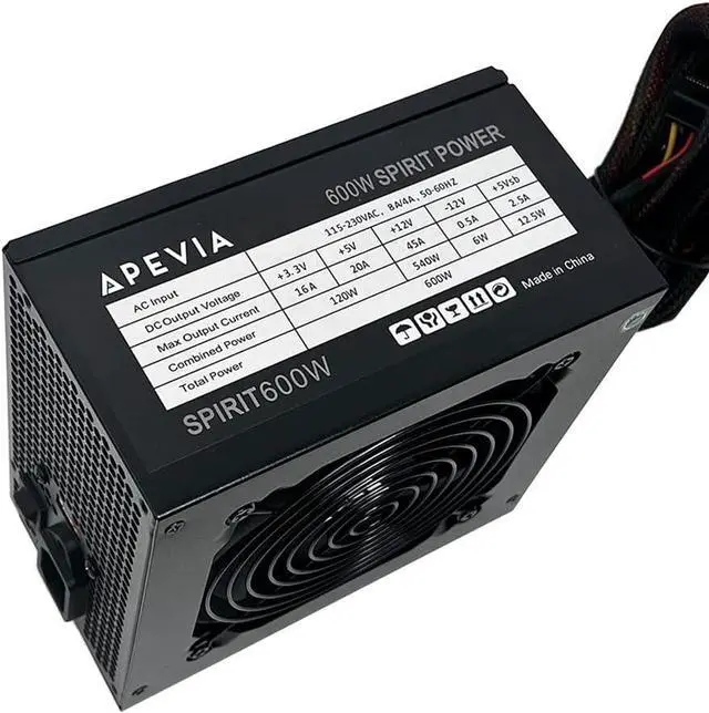 This ItemApevia SPIRIT600W Spirit 600W ATX Power Supply with Auto-Thermally Controlled 120mm Fan, 115/230V Switch, All ProtectionsRecommendationsAPEVIA ASTRO450W Astro 450W ATX Power Supply with Auto-Thermally Controlled 120mm Fan, 115/230V Switch, All Protections 600w Power Supply Non-Modular ATX PSU with 6+2 Pin Connectors PFC Protection and 120mm Silent Fan Gaming PSU KY-600 Black 400W ATX Power Supply, High Efficiency Stable Output ATX Gaming Computer Power Supply with RGB Silent Fan, Desktop Computer Power System for Computer Apevia ATX-ES700-RGB Essence 700W ATX Semi-Modular Gaming Power Supply with Auto-Thermally Controlled 120mm RGB Fan, 115/230V Switch, All Protections Apevia ATX-SP700 Spirit ATX Power Supply with Auto-Thermally Controlled 120mm Fan, 115/230V Switch, All Protections