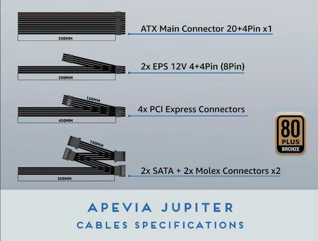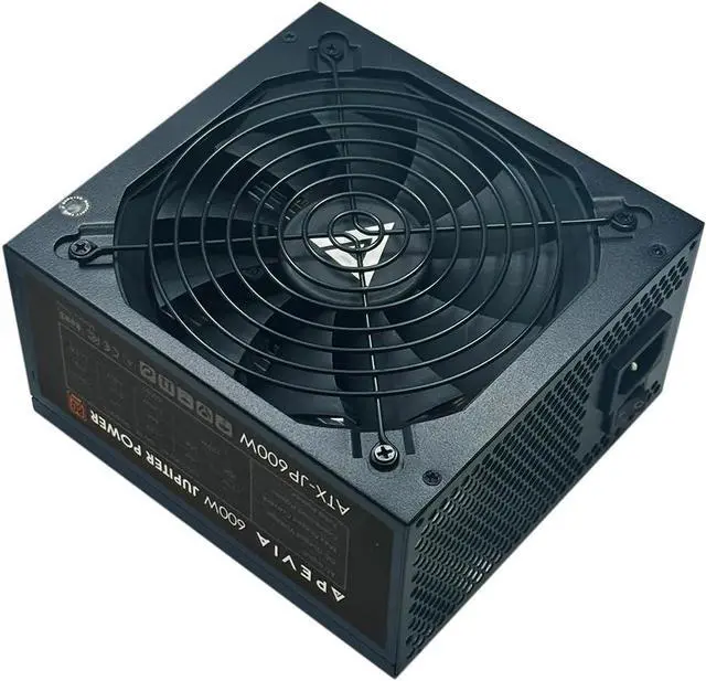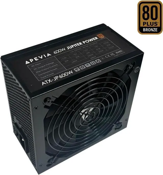 Apevia Jupiter series power supply is 80 Plus Bronze certified. It offers spellbinding performance for high-end PC gaming rigs and extreme systems that demand the most reliable and efficient energy source. This versatile PS supports NVidia SLI, as well as ATI crossfire and Haswell. The Jupiter series is also ideal for dual and quad core CPUs. The thermally controlled automatic sensor regulates fan speed while reducing noise. And a powerful 135mm led fan delivers outstanding ventilation. Model No.: ATX-JP600W Max. Power : 600W Material : Metal Color : Black Switches : Additional Power Switch 115/230 Volt Selector Switch (1)Product Features: 80 Plus Bronze Certified Universal AC Input by Active PFC (99% PF Typical) Cosmic Black Casing Supports Single 12V Output for Higher Power Usage Supports ATX 12V 2.3 Version Supports Dual/Quad Core CPUs Supports SLI, Crossfire & Haswell Automatic Thermally Controlled 135mm Blue LED Fan All Cables are Sleeved Heavy Duty Protections Including OVP (Over Voltage Protection), OPP (Over Power Protection), UVP (Under Voltage Protection) and SCP (Short Circuit Protection) Double Forward Converter Design (2) Connectors 1 x 20/24pin Main Power 2 x 8(6+2)Pin PCI Express 1 x P8(4+4P) ESP 12V 4 x 4Pin Peripheral 4 x Serial ATA 1 x Floppy (3) Input Voltage Ranges:115V/230V Input Freguency:60Hz/50Hz (4)Output +3.3V@20A, +5V@20A, +12V@44A, -12V@0.3A, +5Vsb@2.5A (5) Operating Temperature: The Power Supply Should be Operated in an Ambient Temperature of 0°C to 40°C (6) Overall Performance: Total Output Power: Full Load at Normal Line Input Voltage. Hold up Time: 17ms at Full Load normal Line Input Voltage. Switching Frequency: 50KHz at Normal Line Input. For safety, do not overload, abuse or modify the power supply unit. Use of this unit for Bitcoin Mining is not suggested since it will shorten the life and cause failures of power supply. Use for mining purposes is not covered by warranty.