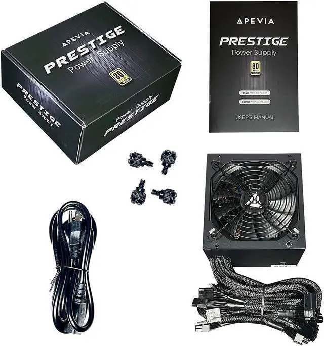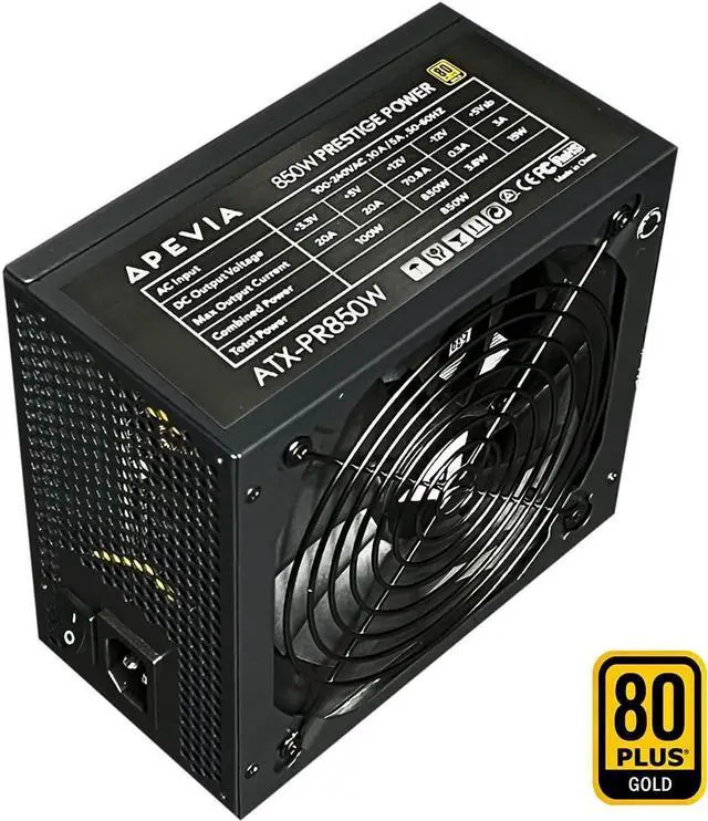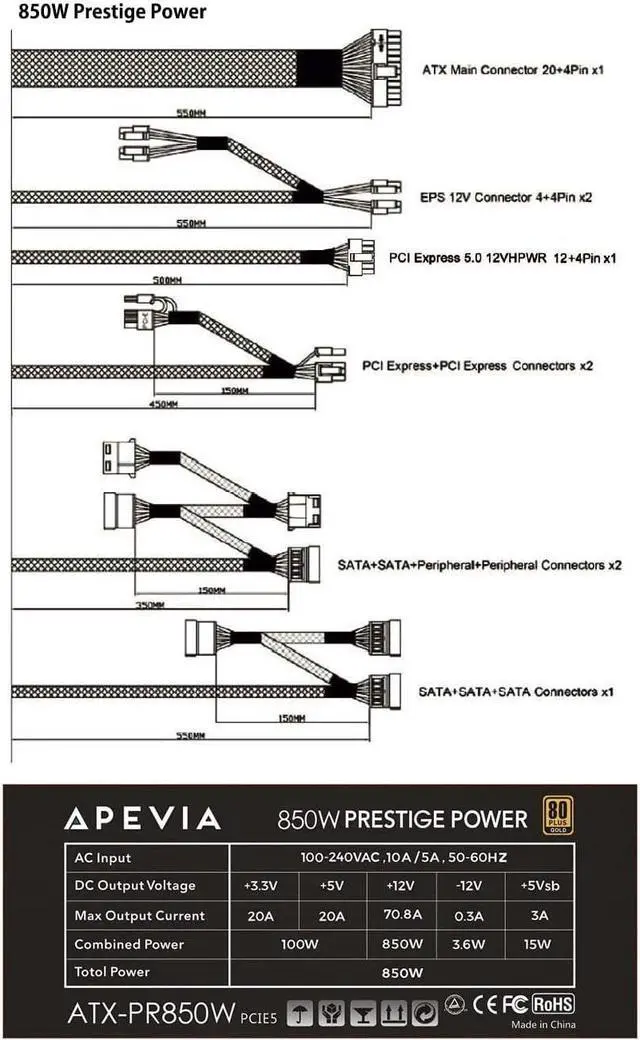 Apevia ATX-PR850W PCIe 5.0 Version Prestige 850W With PCle 5.0 / Gen 5 12VHPWR 12+4 (12pin/16pin) PSU Connector, 80 Plus Gold Certified & RoHS Compliance, Active PFC ATX Gaming Power Supply.