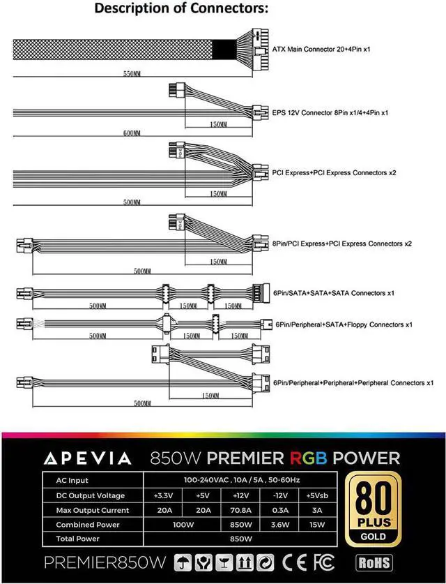 850W 80+ Gold Certified Active PFC ATX Gaming Semi-Modular Power Supply.