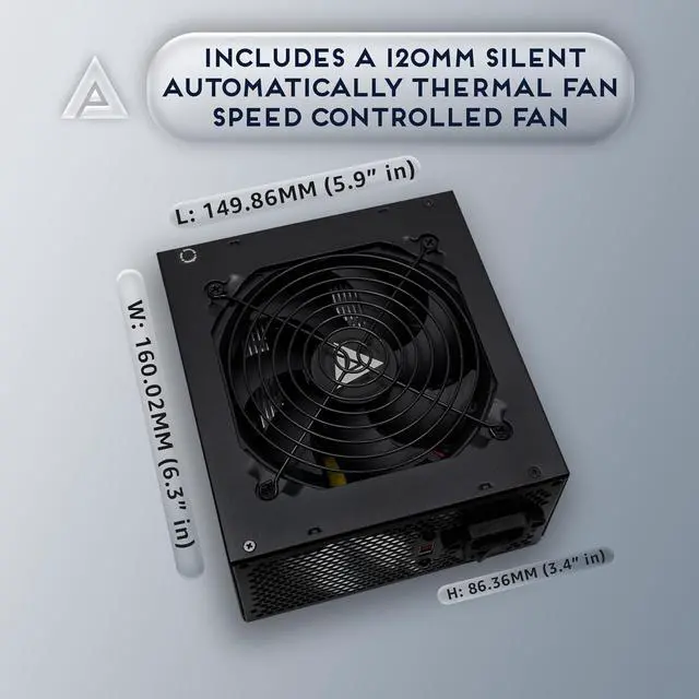 Auto-thermally controlled 120mm black fan. Output: +3.3V@16A, +5V@20A, +12V@53A,