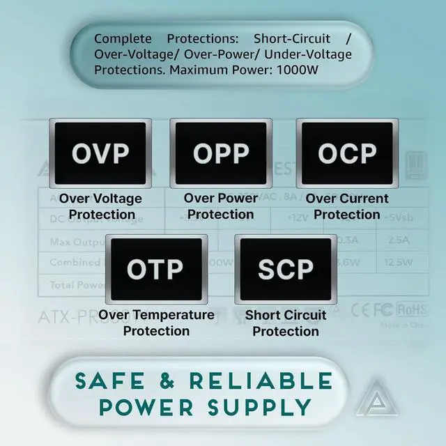 Connectors:1 x 20/24pin Main Power, 1 x 4/8pin 12V, 4 x PCI 6+2pin, 4 x SATA, 4 x Peripheral. Heavy-duty protections, including OVP (Over Voltage Protection), OPP (Over Power Protection), SCP (Short Circuit Protection)