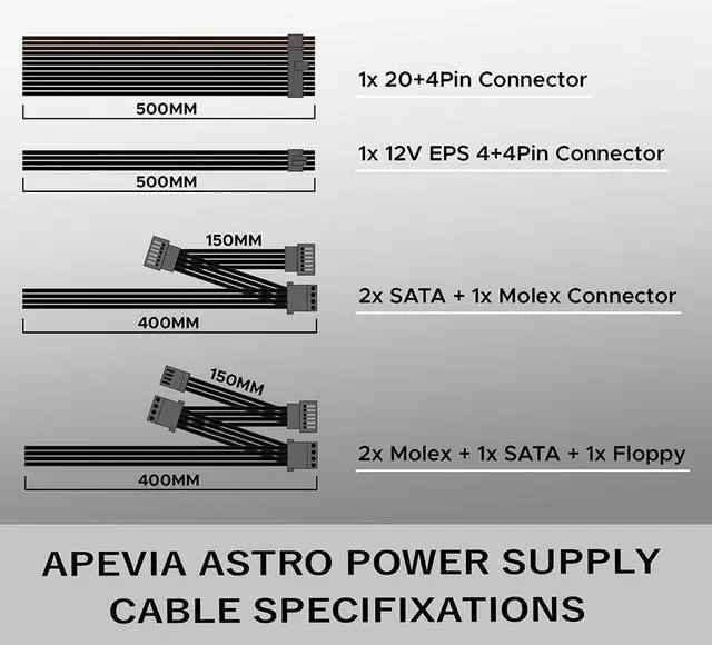 Connectors:1 x 20/24pin Main Power, 1 x 4pin 12V, 3 x SATA, 3 x Peripheral