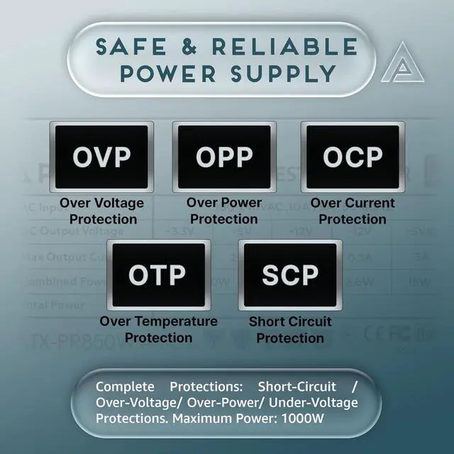 Connectors:1 x 20/24pin Main Power, 1 x 4/8pin 12V, 4 x PCI 6+2pin, 4 x SATA, 4 x Peripheral. Heavy-duty protections, including OVP (Over Voltage Protection), OPP (Over Power Protection), SCP (Short Circuit Protection)
