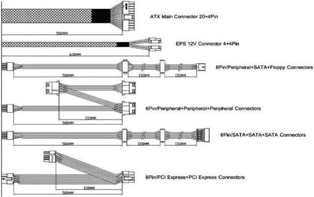 Connectors: 1 x 20/24pin Main Power, 1 x 4+4pin 12V, 2 x PCI 6+2pin, 4 x SATA, 4 x Peripheral