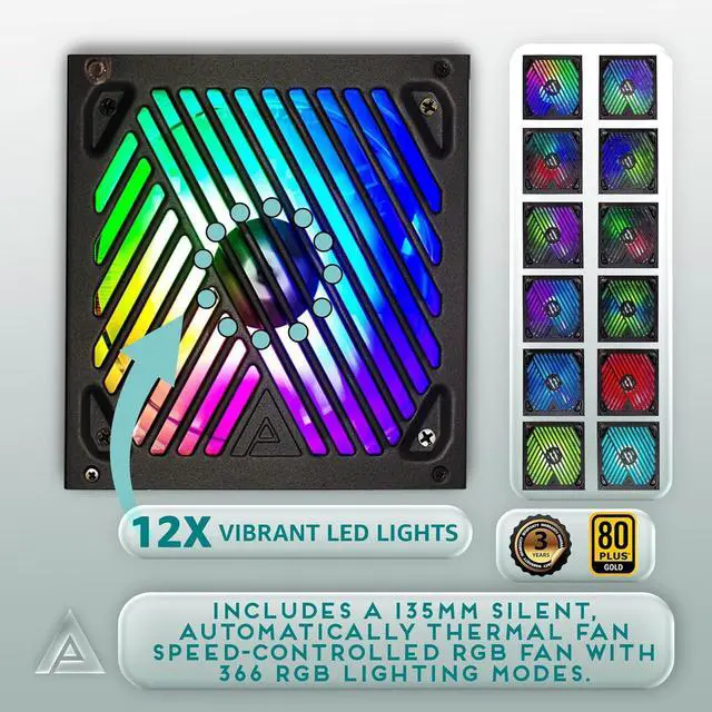 Auto-Thermally Controlled 135mm RGB Fan with 366 RGB Light Modes. Output: +3.3V@20A, +5V@20A,
