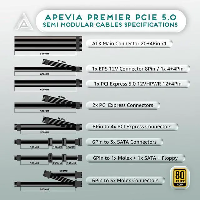 Semi Modular Design Supports Cable Management. Connectors: 1 x 20/24pin Main Power, 2 x P8(4+4P) ESP 12V, 1x PCIE 5.0 / Gen 5 12VHPWR 12+4 (12pin/16pin) GPU Connector, 4 x SATA + 4 x 8(6+2)pin PCI-E, 4 x Peripheral, 1 x Floppy. Single 12V Output for Higher Power Usage