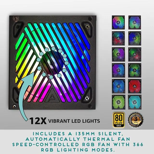 Auto-Thermally Controlled 135mm RGB Fan with 366 RGB Light Modes. Output: +3.3V@20A, +5V@20A,