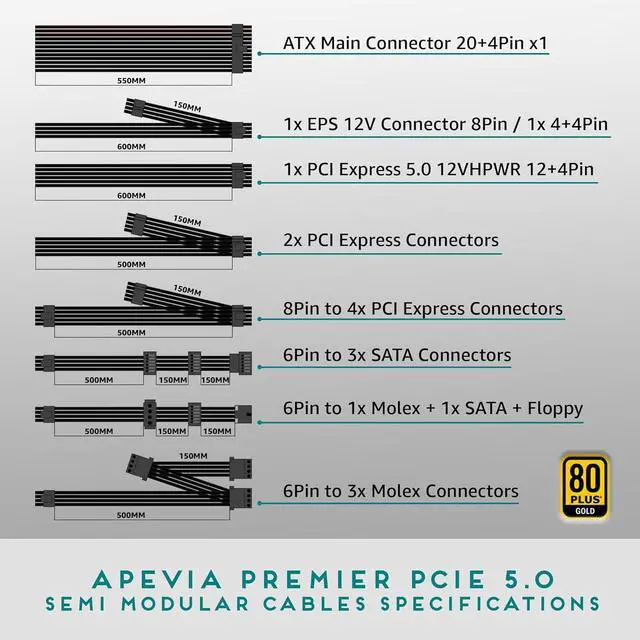 Semi Modular Design Supports Cable Management. Connectors: 1 x 20/24pin Main Power, 2 x P8(4+4P) ESP 12V, 1x PCIE 5.0 / Gen 5 12VHPWR 12+4 (12pin/16pin) GPU Connector, 4 x SATA + 4 x 8(6+2)pin PCI-E, 4 x Peripheral, 1 x Floppy. Single 12V Output for Higher Power Usage