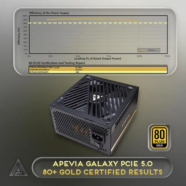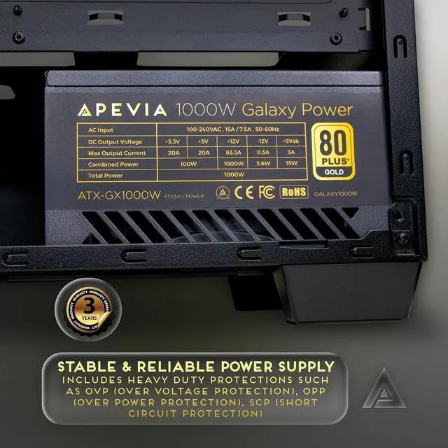 Apevia ATX-GX1000W PCIe 5.0 Version Galaxy 850W With PCle 5.0 / Gen 5 12VHPWR 12+4 (12pin/16pin) PSU Connector, 80 Plus Gold Certified & RoHS Compliance, Active PFC ATX Gaming Power Supply.