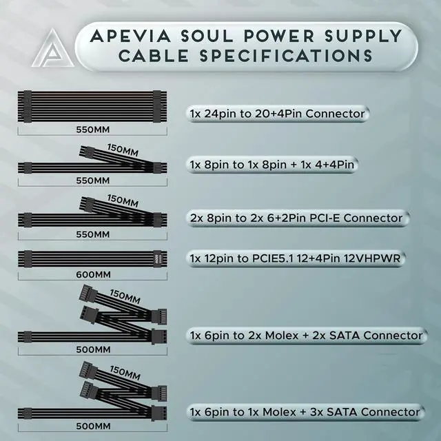 Apevia 850W Soul ATX 3.1 & PCIE 5.1 Ready With 12+4Pin (16pin) 12VHPWR Cable ATX Fully Modular Active PFC Gaming Power Supply With Flat Black Modular Cable Connectors