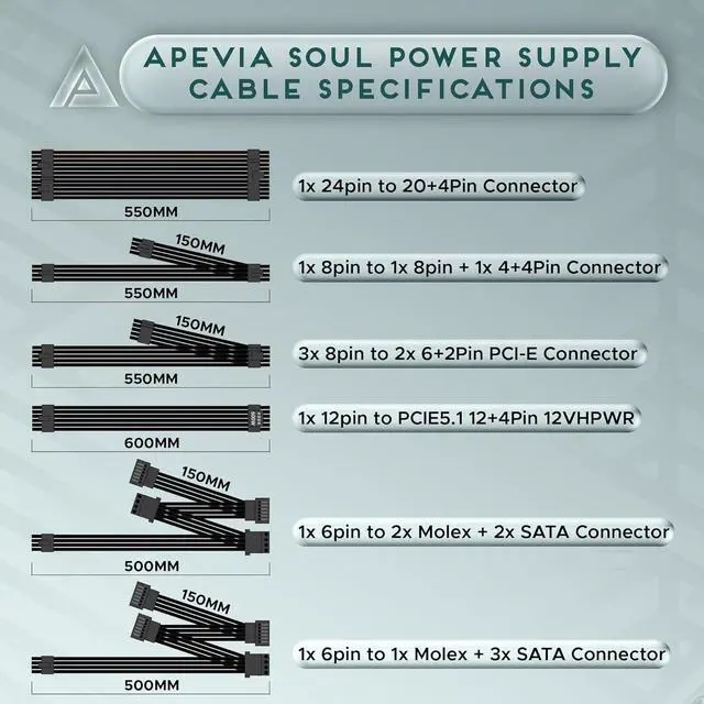 Apevia 1000W Soul ATX 3.1 & PCIE 5.1 Ready With 12+4Pin (16pin) 12VHPWR Cable ATX Fully Modular Active PFC Gaming Power Supply With Flat Black Modular Cable Connectors