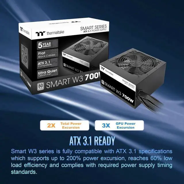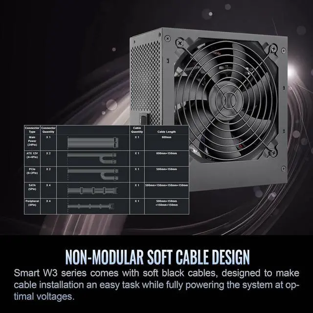 The Smart W3 series is certified by 80 PLUS efficiency and designed to meet ATX 3.1 standards, offering 500W, 600W, and 700W options. It's perfect for budget-conscious users seeking an efficient and reliable entry-level power supply, backed by a solid 5-year warranty. Ultra-quiet 120mm cooling fan delivers excellent airflow at an exceptionally low noise level. P/N: P223S-SPW-0700NNFAWU-1 Model: SP3-700AH2NLW Type: Analog Watts: 700W Color: Black Dimensions: 150mm(W)x86mm(H)x140mm(D) PFC (Power Factor Correction): Active PFC Power Good Signal: 100-150 msec Hold Up Time: 17msec at 80% load Input Current: 12A - 6A Input Frequency Range: 50Hz/60Hz Input Voltage: 100-240V Operating Temperture: 5°C to + 40°C Operating Humidity: 20% to 85% Storage Temperture: -40°C to + 55°C Storage Humidity: 10% to 95% Cooling System: 12cm FDB Fan Efficiency: Meet 80 PLUS® at 115Vac input. MTBF: 100 Safety Approval: CB/FCC/cTUVus/ICES/UKCA/CE/LVD/RCM PCI-E 6+2PIN: 2 Protection: OCP/OVP/UVP/OPP/OTP/SCP