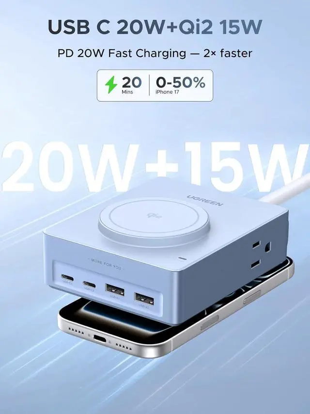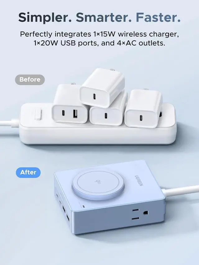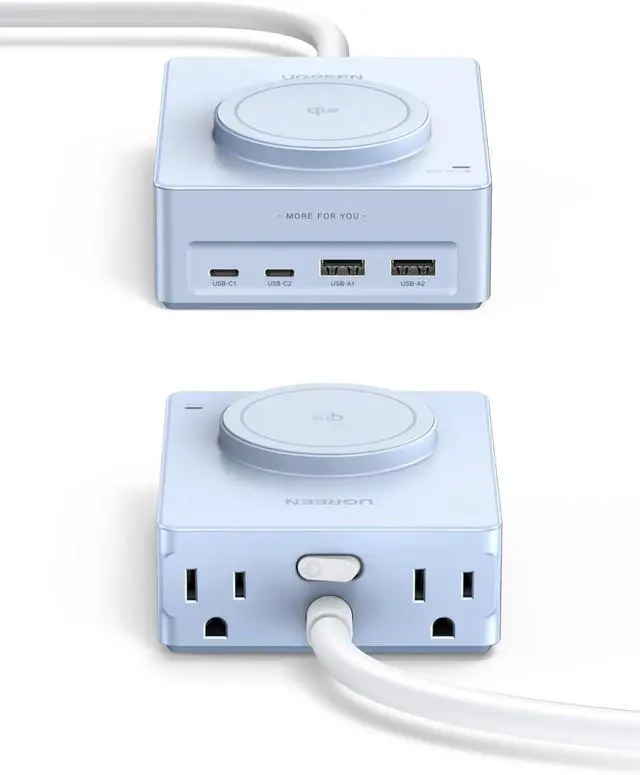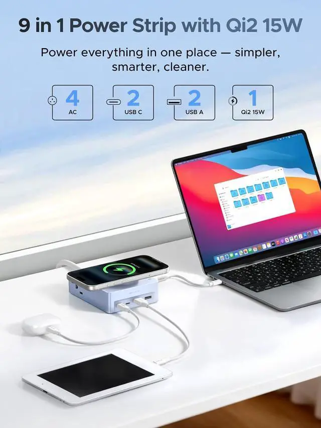 9 in 1 Desktop Power Station: Upgrade your workspace with our power strip, featuring 2 USB A and 2 USB C ports and 15W magnetic wireless charging alongside 4 AC outlets for simultaneous charging of up to 9 devices, and our USB Charging Hub that tidies your desk while powering your devices efficiently