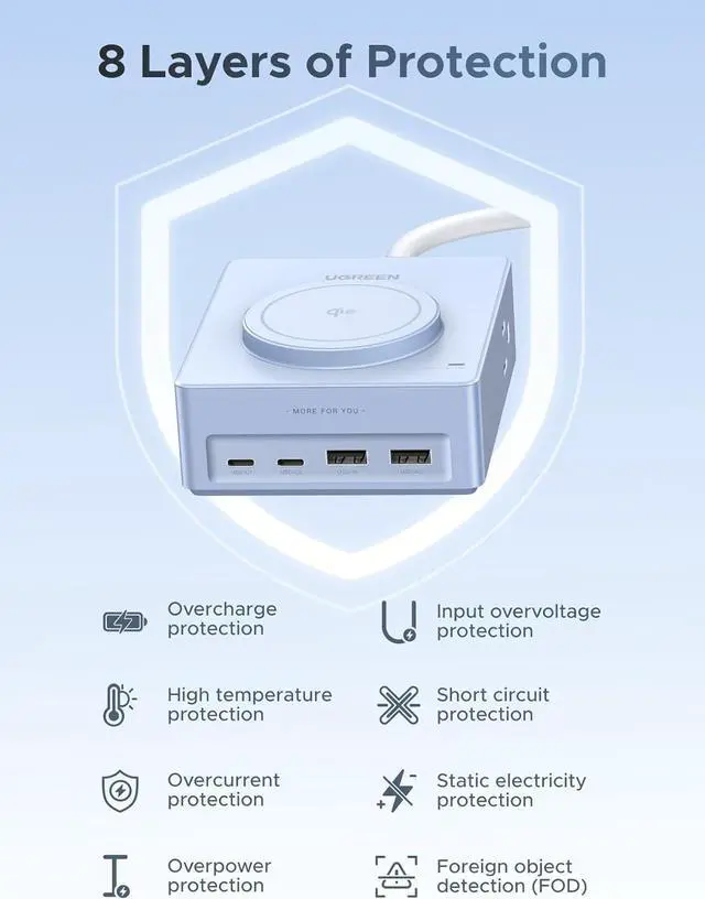 Multi-protection Design: Experience reliable protection for your devices with our surge protector tower power bar , complete with safeguards against over-voltage, over-charge, over-current, and short-circuits. The compact, lightweight Power Station with 15W Wireless Fast Charging is perfect for travel