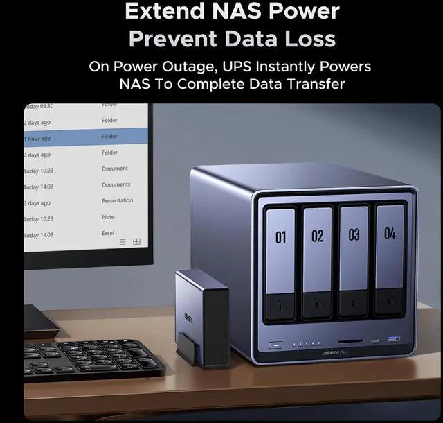 "Works Quietly and Looks Compact : The UPS wont disturb you while you are working or sleeping. What's more, its compact size fits perfectly with UGREEN NAS for a clean setup."