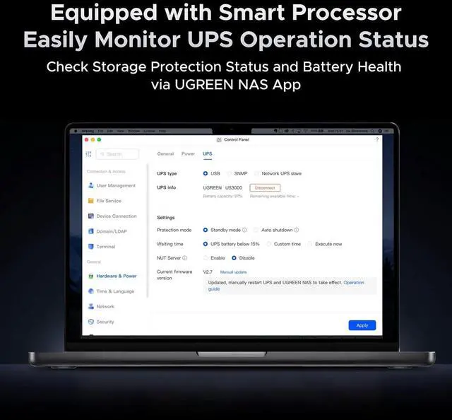 Multiple Protection Safe Power Supply: The UPS battery backup has implemented certified security protocols, including power failure protection, surge protection, over-charge protection, over-current protection, and short-circuit protection. It 100% ensures that your UGREEN NAS will be connected to power as secure as possbile. Besides, its built-in Li-ion battery has a long lifespan because of its low energy comsumption.